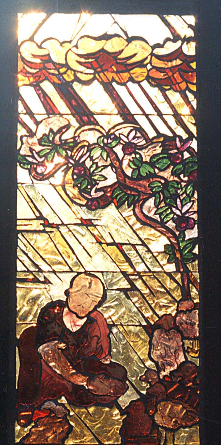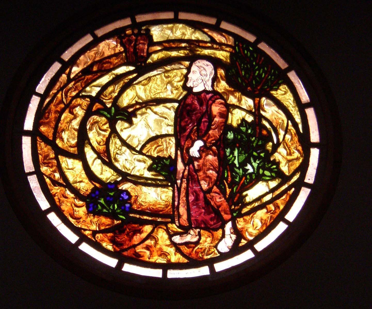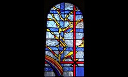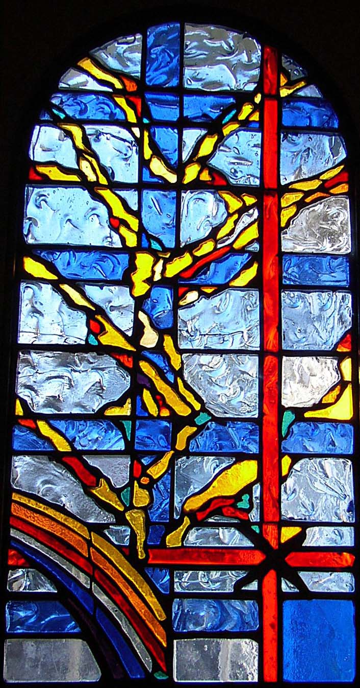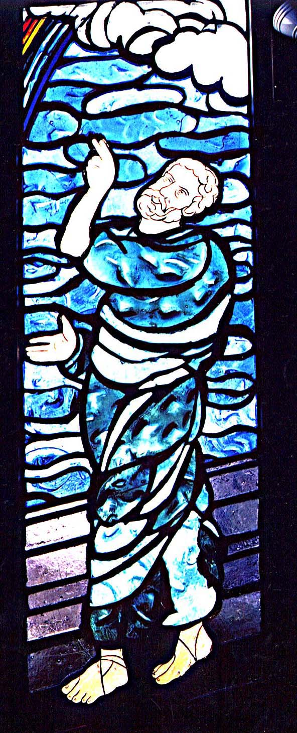 Vitrail dans lequel Noé désigne l’Arc en ciel symbolisant l’Alliance