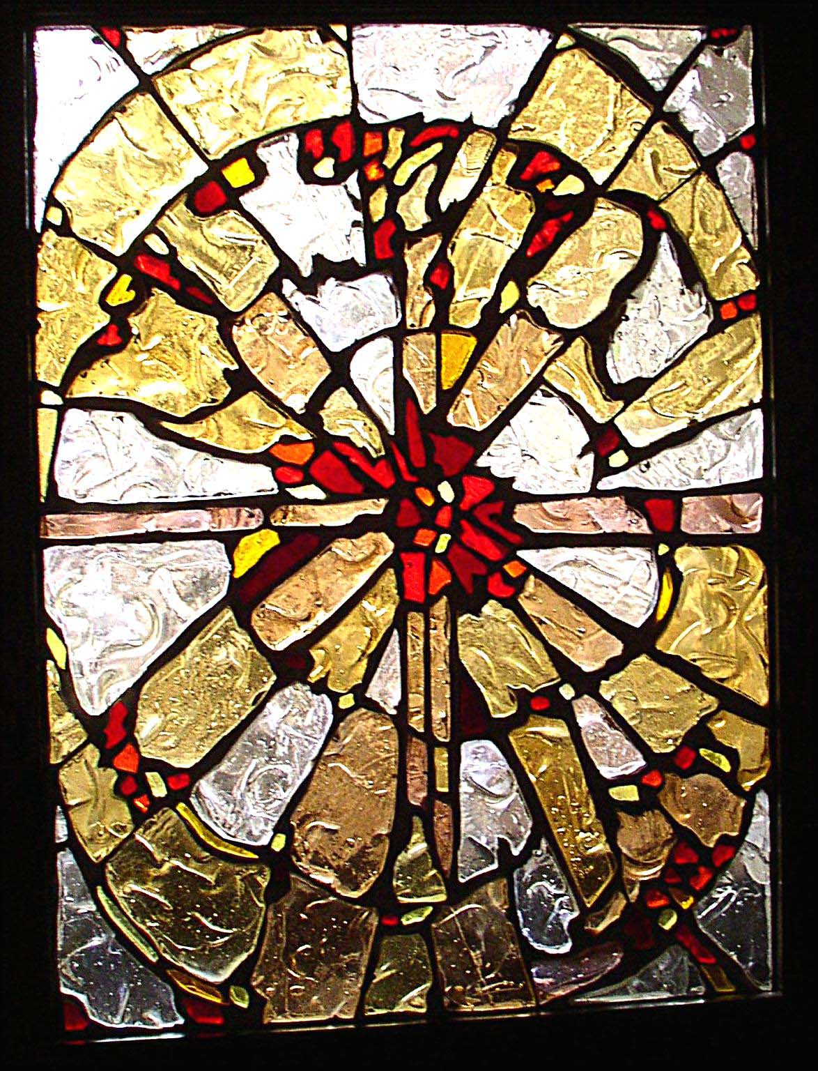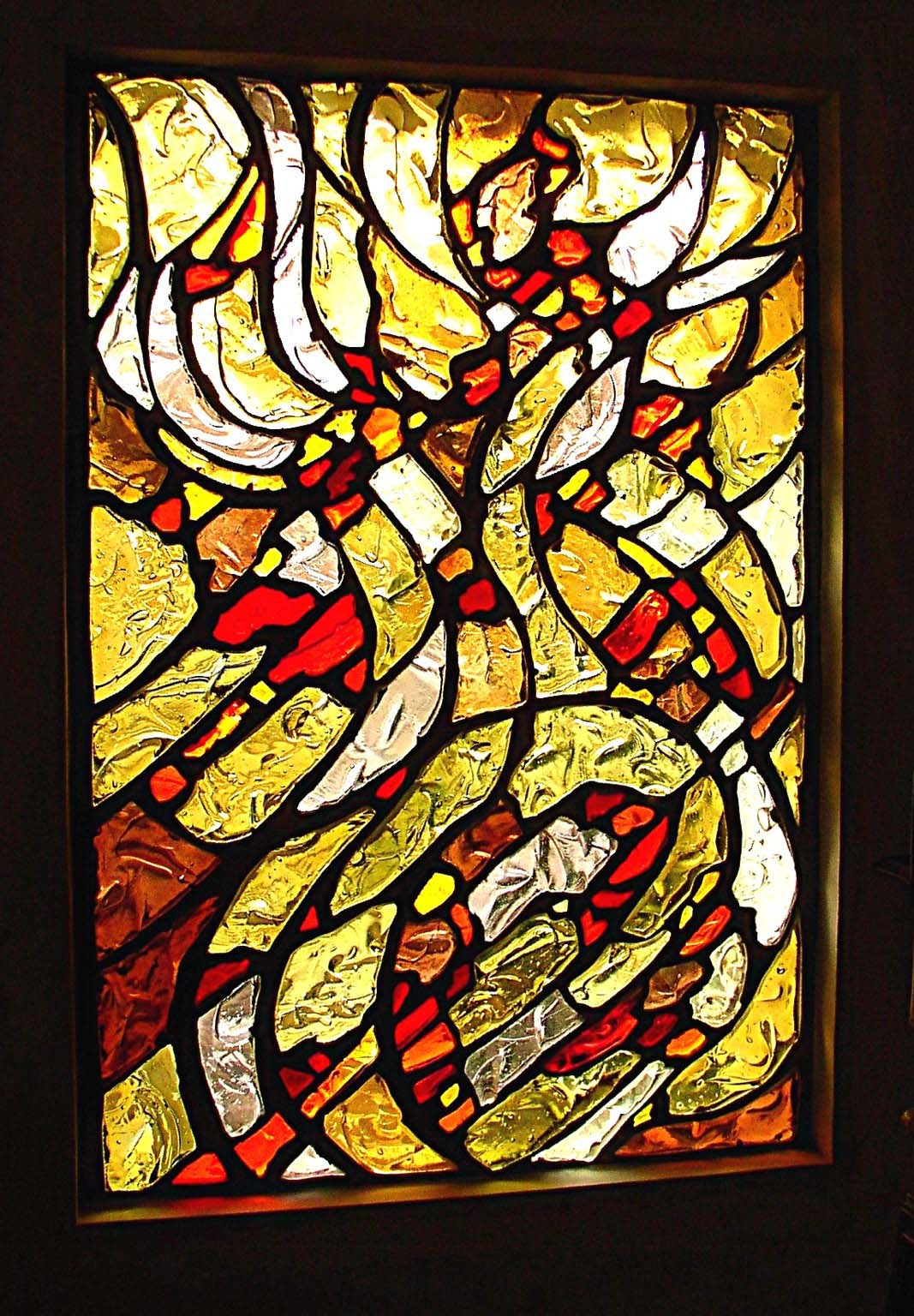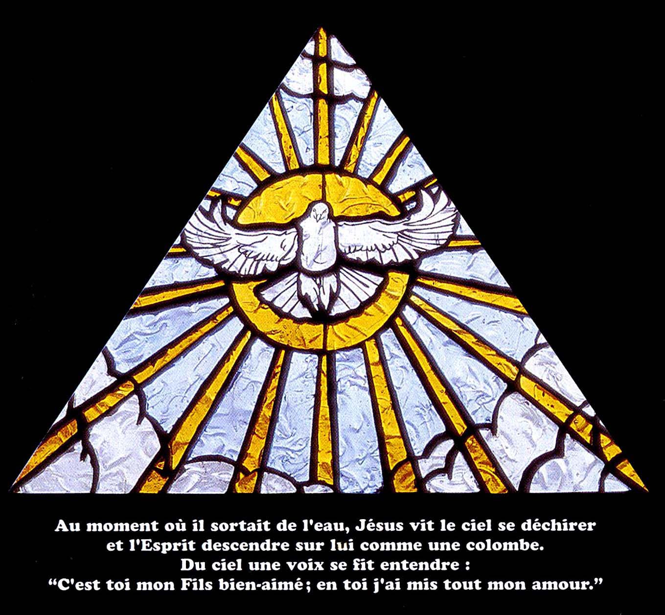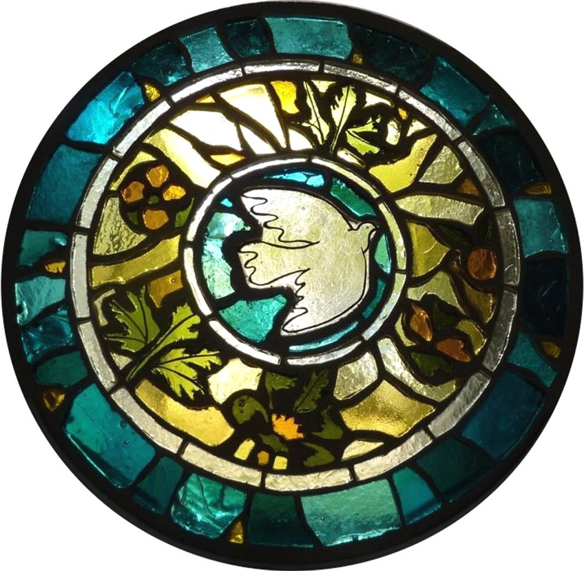 Vitrail dont la colombe symbolise l’Esprit Saint qui rayonne