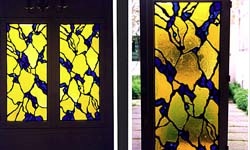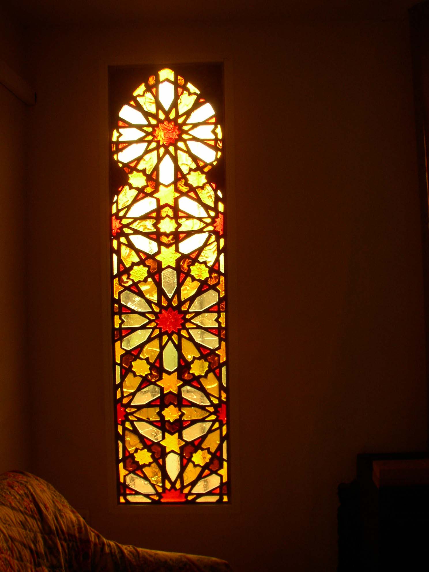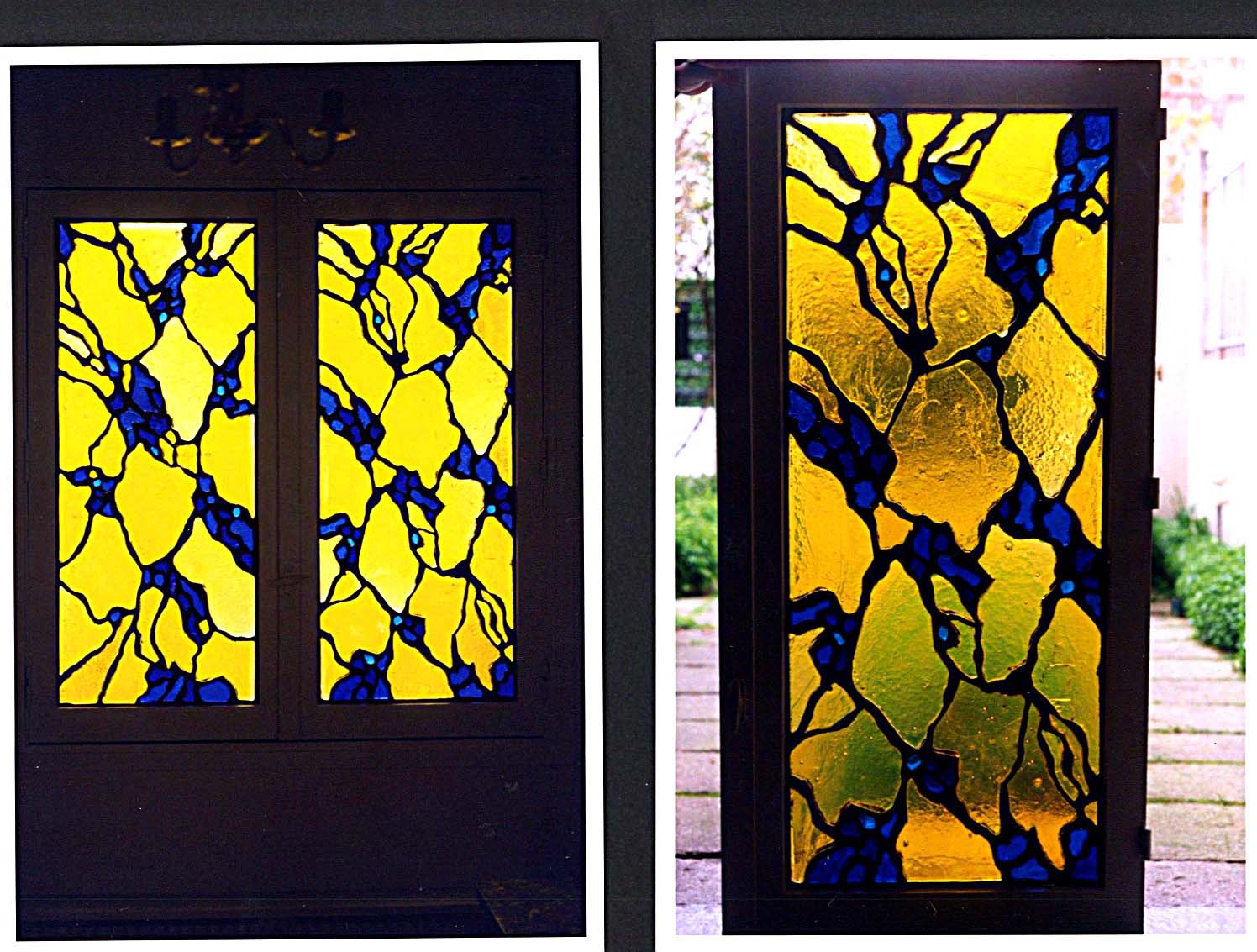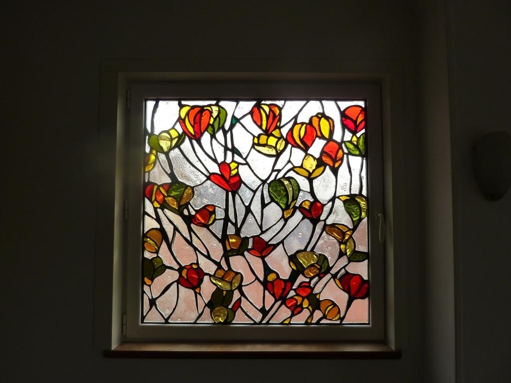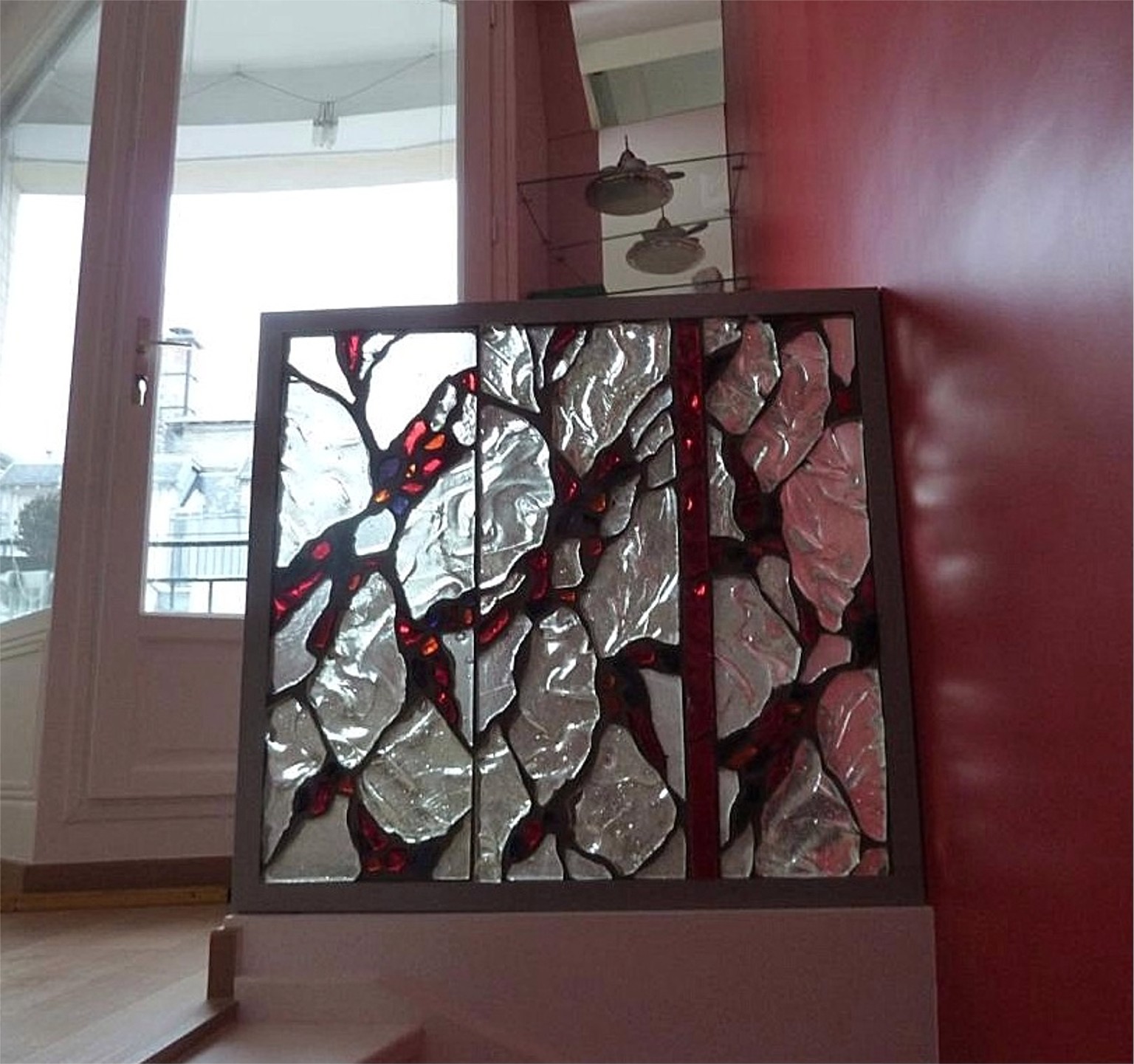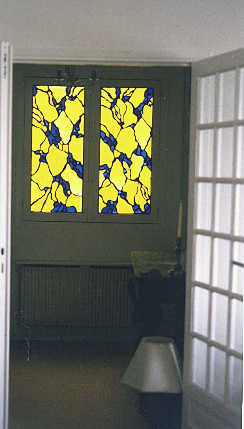 Installée dans un couloir d’entrée, ce vitrail apporte une tonalité chaude et lumineuse à l’espace