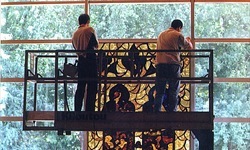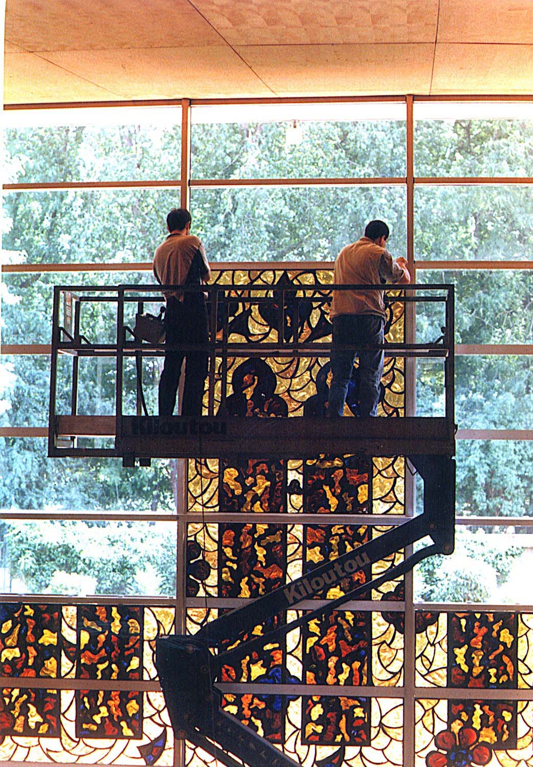 Installation des panneaux créés pour la verrière de la Chapelle de Chelles (77)